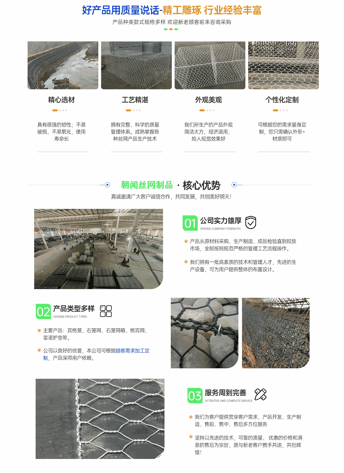 深州市朝聞絲網(wǎng)制品有限公司擁有“中國絲網(wǎng)之鄉(xiāng)”美譽(yù)的河北省致力于生產(chǎn)銷售格賓網(wǎng),雷諾護(hù)墊,景觀石籠網(wǎng),邊坡防護(hù)網(wǎng),綠濱墊,固濱籠的廠家,規(guī)格多種多樣。 我廠堅(jiān)持技術(shù)創(chuàng)新、科學(xué)管理、誠信經(jīng)營,注重引進(jìn)新型生產(chǎn)技術(shù)設(shè)備,推行標(biāo)準(zhǔn)化生產(chǎn),采用質(zhì)量管理體系,從原材料采購、生產(chǎn)管理、產(chǎn)品檢測(cè)等關(guān)鍵環(huán)節(jié)嚴(yán)格把關(guān),確保了產(chǎn)品質(zhì)量,贏得了客戶的信賴。我公司秉承“誠信、務(wù)實(shí)、高效”的企業(yè)宗旨,真誠希望與世界各地客戶互惠互利,共創(chuàng)美好未來!多年來"以誠立廠","以質(zhì)興業(yè)"。 憑借過硬的質(zhì)量、良好的信譽(yù)、優(yōu)質(zhì)的服務(wù)、合理的價(jià)格不斷拓展市場(chǎng),誠摯的希望在平等互利,坦誠相待的基礎(chǔ)上與國內(nèi)外客戶長期合作!...